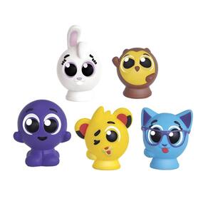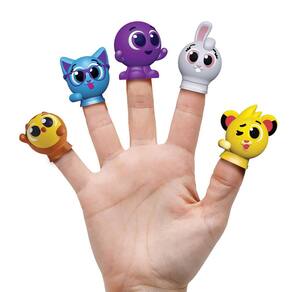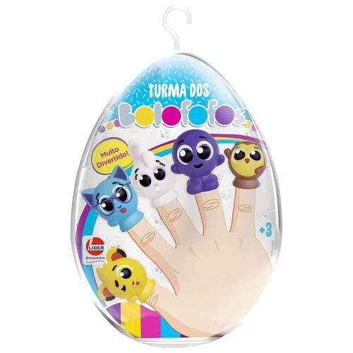 contém 5 dedoches dos personagens bolofofos - pipi, sophie, pow, bunny e rick fabricados em vinil atóxico