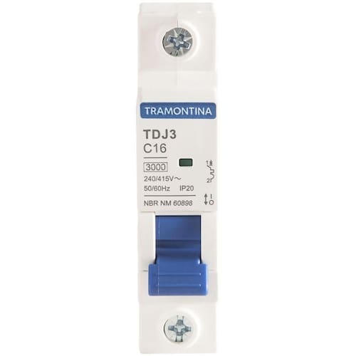 Minidisjuntor Tdj3ka 1 P 16 A Curva C Tramontina Minidisjuntor TDJ3kA 1 P 16 A curva C Tramontina Leve alta qualidade para seus projetos elétricos, com o minidisjuntor TDJ3kA 1 P 16 A curva C Tramontina. Desenvolvido para garantir a segurança da instalação ele preserva a rede elétrica e seus equipamentos em caso de sobrecarga ou curto-circuito. Ele possui janela de inspeção do estado, é instalado no quadro de distribuição e dimensionado de acordo com a potência dos equipamentos, números de tomadas e quantidade de lâmpadas. Sua montagem é individual, sem a necessidade de desmontar o barramento, o que otimiza o tempo de instalação. Um item com a qualidade Tramontina, que você já conhece e confia!