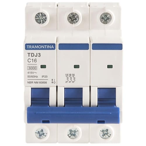 Minidisjuntor Tdj3ka 3 P 16 A Curva C Tramontina Minidisjuntor TDJ3kA 3 P 16 A curva C Tramontina Com o Minidisjuntor TDJ3kA 3 P 16 A curva C Tramontina você irá garantir alta qualidade para seus projetos elétricos. Desenvolvido para garantir a segurança da instalação, ele preserva a rede elétrica e seus equipamentos em caso de sobrecarga ou curto-circuito. Ele possui janela de inspeção do estado, é instalado no quadro de distribuição e dimensionado de acordo com a potência dos equipamentos, números de tomadas e quantidade de lâmpadas. Sua montagem é individual, sem a necessidade de desmontar o barramento, o que otimiza o tempo de instalação. Um item com a qualidade Tramontina, que você já conhece e confia!
