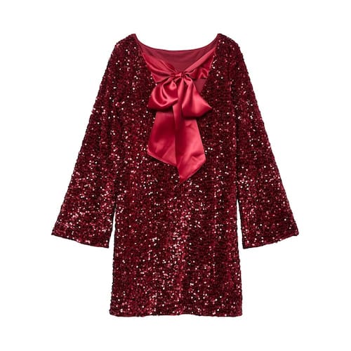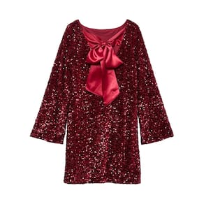 HOCANDY Minivestido feminino de manga longa com lantejoulas brilhantes, costas nuas, laço e gravata borboleta, caimento solto, para festas, coquetéis, glitter, Vermelho