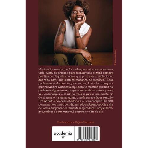 AO CONTRÁRIO DE TENTAR SER A SUA MELHOR VERSÃO, PROCURE SER A VERSÃO POSSÍVEL, EXECUTÁVEL E SUSTENTÁVEL. A MELHOR SERIA SONHAR ALTO DEMAIS. Você está cansado das fórmulas para alcançar sucesso a todo custo, da pressão para manter uma atitude sempre positiva ou daqueles cursos que prometem revolucionar sua vida com uma simples mudança de mindset? Seus problemas acabaram... ou, pelo menos, diminuíram um pouquinho! Jacira Doce está aqui para te mostrar que não há problema algum em entregar o seu mais ou menos possível, tentar seguir o caminho mais seguro e, finalmente, rir de si mesmo – mesmo quando nada parece fazer sentido. Em Minutos de (des)sabedoria, a autora compartilha 100 pensamentos muito bem-humorados sobre nosso dia a dia de forma surpreendentemente inspiradora. Porque, às vezes, melhor do que vencer, é empatar no fim do dia.