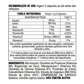 Mio-inositol + associacoes 60cps flora nativa Como tomar Sugere-se a ingestão de 1 uma cápsula deste produto 2 duas vezes ao dia ao dia, preferencialmente junto das principais refeições, ou de acordo com orientação . Tabela nutricional Inositol 300mg Cromo 200mcg 571% Zinco 7mg 100% Vitamina b1 2mg 166% Vitamina b6 90mg 6923% Vitamina d 50mcg / 2000 ui 1000% Vitamina k 50mcg 77% Ingredientes Mio-inositol, cloridrato de piridoxina vitamina b6 , bisglicinato de zinco, menaquinona-7 vitamina k2 , cloridrato de tiamina vitamina b1 , picolinato de cromo, colecalciferol vitamina d3 , silicitado de magnésio ins 553i , dióxido de silício 551 . Cápsula: gelatina, clorofila cúprica sódica. Não contém glúten. Produto isento de registro conforme rdc 240/2018. Marca: Não Informado