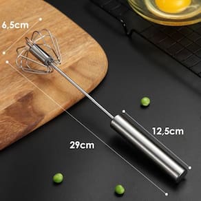 Misturador batedor mixer de ovos e claras giratório semi automático. Ideal para preparar claras em neve, chantilly, ovos e massas leves. Funcionamento semi automático dispensa o uso de energia elétrica: basta pressionar o cabo para baixo que o misturador gira. Fabricado em aço inoxidável com cabo revestido em aço. Design anatômico.Acompanha copo
