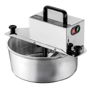 Misturador elétrico para doces e massas com panela em alumínio e acabamento em inox 430 polido. Possui controle de velocidade, espátulas de silicone resistentes a altas temperaturas e botão de segurança. Ideal para produção de brigadeiros, recheios, coberturas e massas.Lâmpada piloto