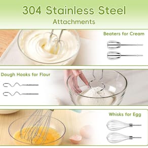 - ? Misturador portátil com tigelas para assar: esta é uma combinação versátil, um ótimo utensílio de cozinha para assar, cozinhar, servir, misturar e preparar. Este conjunto de itens essenciais de cozinha inclui uma batedeira elétrica portátil com 4 acessórios (batedores de balão, batedores, ganchos de massa), 4 tigelas de mistura, 4 copos medidores de aço inoxidável, 7 colheres de medição de aço e outras ferramentas de cozimento. Todos os acessórios de aço inoxidável podem ser lavados na máquina de lavar louça e na geladeira.