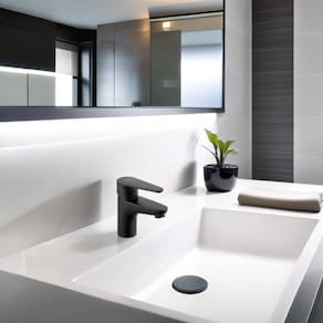 O monocomando encanta por suas formas orgânicas e suaves em contraponto aos planos que interceptam essa sinuosidade, criando assim uma perfeita harmonia entre o moderno e minimalista. Essa conjunção de formas torna-se uma solução de elegância e funcionalidade para os espaços de banho atuais, combinando com ambientes distintos e confortáveis. O conjunto estético e funcional encaixa-se perfeitamente em banheiros com decoração leve, onde o monocomando se equilibra com o mobiliário e a cuba através de sua robustez e simplicidade.
