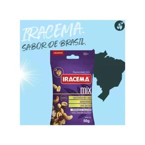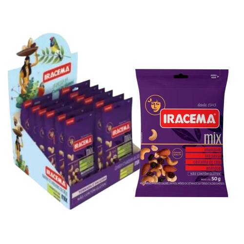 Mix amêndoas de castanha de caju, amêndoa, amendoim e uva-passa Iracema sachê com 50 gramas. Caixa contendo 12 unidades. Peso líquido total 600 gramas.