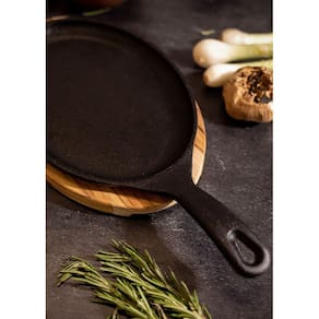 Design e praticidade. Ideal para preparar e servir alimentos. Chapa fabricada em ferro fundido, altamente resistente, podendo ser utilizada diretamente sobre o fogão, 380x182x36mm. Tábua em Madeira Teca.