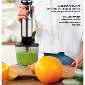 Características Gerais do produto Mixer 3 emetros 1 EOS cometros potência de 850W, 12 velocidades, acessórios remetrosovíveis para limetrospeza, processador de 250g e design emetros inox.