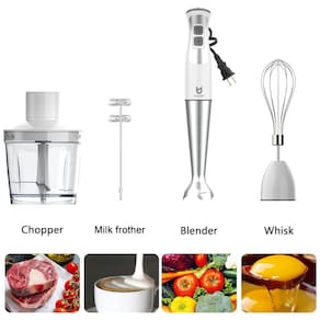 FÁCIL DE LIMPAR E . Os acessórios destacáveis são mais fáceis de limpar, sem produtos químicos com ETL, laváveis na máquina de lavar louça e sem BPA. ACESSÓRIO DE LEITE O espumador de leite portátil faz espuma de leite para o seu café. MAIS PODEROSO. Potente varinha mágica de 250 watts com 8 velocidades turbo para batidos de leite, sopas ou comida para bebé. Baixo ruído e agitação. LIQUIDIFICADOR DE ALTA EFICIÊNCIA. Varinha de mistura grossa de aço inoxidável com sistema de 4 lâminas. Torne a mistura de alimentos mais eficiente, uniforme e suave