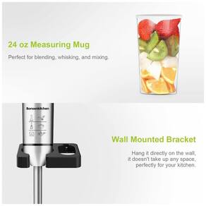 Mixer de imersão 5 em 1 com motor de alta potência de 225W, 9 velocidades ajustáveis, tecnologia de redução de ruído, design anti respingo e construção em aço inoxidável.Acompanha copo