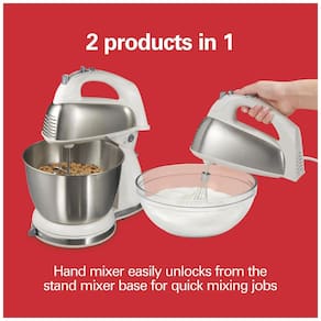 A Batedeira Hamilton Beach Classic Stand Mixer se converte facilmente em uma batedeira de mão. Acompanha 5 acessórios, uma tigela de aço inoxidável de 4 litros e 6 velocidades. Enquanto você mistura, a alavanca Shift Stir permite mover a tigela de um lado para o outro para uma mistura completa. 2 PRODUTOS EM 1. Por que ocupar espaço na sua cozinha com 2 batedeiras quando um eletrodoméstico economizador de espaço faz tudo? A batedeira de pedestal é perfeita para misturas densas como massa de biscoito e pão, e a batedeira de mão desencaixa facilmente da base para trabalhos de mistura rápidos. 5 ACESSÓRIOS E TIGELA DE 4 LITROS DE AÇO INOXIDÁVEL. O conjunto inclui 2 batedores tradicionais, 2 ganchos para massa e um batedor de claras, e a tigela de 4 litros é grande o suficiente para suas receitas favoritas. Para facilitar a limpeza, os acessórios e a tigela podem ir à lava-louças. MOTOR POTENTE PARA TODAS AS SUAS NECESSIDADES DE MISTURA. O motor de 290 watts de potência máxima permite que você facilmente faça de tudo, desde misturar massa e amassar uma massa espessa até bater claras em neve fofas. TIGELA SE MOVE LADO A LADO PARA MISTURAR COMPLETAMENTE. Enquanto você mistura, a alavanca Shift Stir permite mover a tigela de um lado para o outro para uma mistura completa de todos os ingredientes. 6 VELOCIDADES COBREM CADA TAREFA DE MISTURA. Vá desde dobrar ingredientes lentamente até bater em alta velocidade. Essa batedeira de mão possui 6 velocidades para cobrir cada tarefa de mistura e um botão Quick Burst para uma explosão extra de potência em qualquer velocidade. 290 watts de potência máxima.