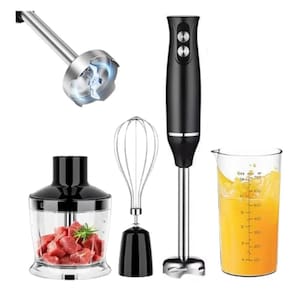 Mixer 4 em 1 com 500W de potência, inclui mixer, batedor, picador e triturador. Possui velocidade ajustável, lâminas de aço inoxidável, design ergonômico e peças removíveis compatíveis com lava-louças.Acompanha copo