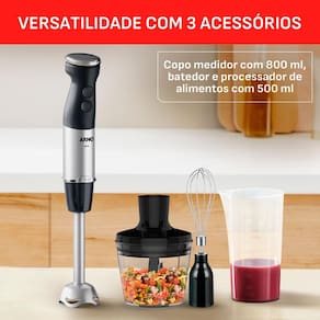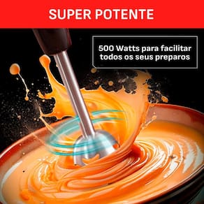 Arno Quick chef +, com tecnologia Powelix é a escolha perfeita para quem busca desempenho, praticidade e silêncio na cozinha. Com motor de 500w, ele garante até 3 vezes mais eficiência* no preparo de receitas, triturando até os ingredientes mais duros com facilidade. A tecnologia Powelix oferece alto poder de corte, com lâminas ultra afiadas que entregam resultados rápidos e homogêneos em qualquer tipo de preparo. Com painel digital com 20 velocidades, você tem o controle total, adaptando o uso conforme a textura desejada. O modo silencioso permite preparar suas receitas com conforto, ideal para uso diário sem incômodos. Acompanha 3 acessórios essenciais: copo medidor de 800ml, processador de alimentos de 500ml e batedor de claras, perfeitos para preparar desde smoothies, até chantillys e massas leves. Além de potente, o mixer feito em aço inoxidável é prático: pode ser diretamente na panela, seu pé é removível, facilitando a limpeza, e o design com protetor anti-respingos evita sujeiras indesejadas. Compacto, ergonômico e fácil de guardar, o Quick Chef+ é seu aliado para preparar molhos, sopas, sucos, purês e muito mais, com agilidade, eficiência e a qualidade que só a Arno oferece.