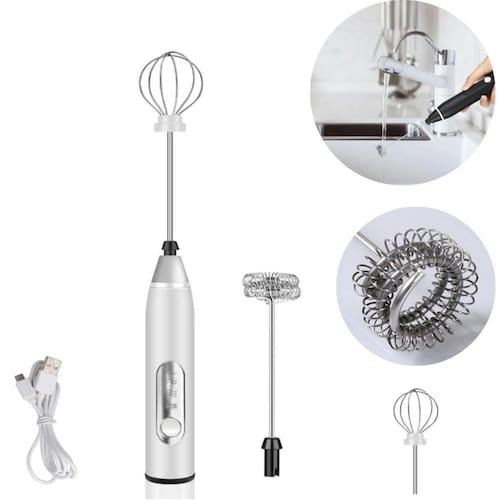 Leve (200g), 3 opções de velocidade, Bateria recarregável via USB, Haste em inox removível, Ideal para bebidas quentes e geladas, misturar molhos e bater ovos.