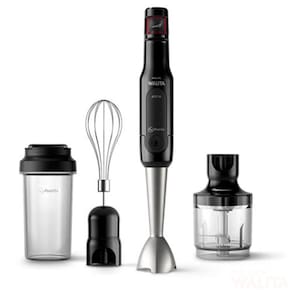 Copo On-the-Go Copo com tampa permite que você possa levar suas receitas preferidas para qualquer lugar com mais praticidade Proteção antirrespingos, o mixer impede os pingos e mantém sua bancada limpa, moedor e muito mais praticidade para sua cozinha, com esse Mixer é possível picar cebola, queijo e muito mais. Lâmina de dupla ação O mixer Philips Walita vem com uma lâmina de dupla ação que corta na horizontal e na vertical. Acessório batedor de claras Para o preparo de creme batido, maionese, massa de panqueca e mais, o acessório de batedeira simples torna o seu mixer multifuncional e versátil.