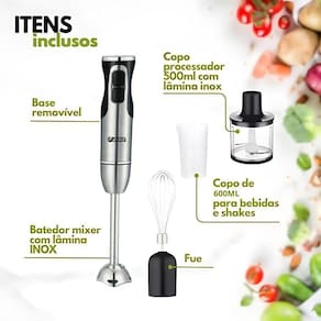 Mixer triturador com 4 lâminas em inox, motor de 500W, proteção contra superaquecimento, corpo removível para fácil limpeza. Inclui 2 copos versáteis, ponta mixer e ponta fue batedor.Acompanha copo