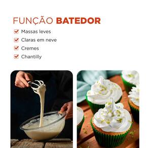 3 EM 1: IDEAL PARA A SUA COZINHA: São três funcionalidades: MIXER, BATEDOR e TRITURADOR. O batedor de claras em neve é ideal para bater massas leves, cremes e chantilly. Já o triturador funciona como processador de alimentos e é indicado para picar vegetais, legumes, ervas, temperos. Com a função mixer, você pode produzir sopas, papinhas de bebê, molhos, milk-shakes, sucos, vitaminas, e muito mais!