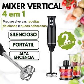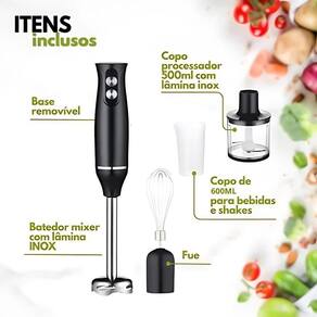 Mixer turbo 4 em 1 preto 300w 220v - desempenho e velocidade Destaques que encantam: Feito com materiais premium e lâminas em inox, ele não é apenas um produto - é um investimento em qualidade e durabilidade o motor de 300w garante potência para qualquer tarefa, enquanto a proteção contra superaquecimento te oferece segurança durante o uso prolongado. E o melhor Seu corpo removível facilita a limpeza, economizando seu tempo Leve leveza e agilidade à sua cozinha e impressione com resultados dignos de um chef não perca a chance de trazer mais sabor e praticidade para o seu dia a diacaracterísticas do produto: -------------------------------------------- praticidade e versatilidade: com 2 copos versáteis e potentes lâminas em inox, ele permite que você prepare desde sucos refrescantes e smoothies cremosos até triturar os alimentos mais difíceis, como legumes e carnes; design moderno, feito com materiais premium para qualquer tipo de receita, trazendo sofisticação e funcionalidade; potente e eficiente: motor de 300w de potência; ------------------- Cuidados: ------------------- guarde o produto sempre limpo; não coloque a mão ou objetos no rotor enquanto estiver funcionando; verifique a voltagem da tomada antes ligar; ------------------- Ficha técnica: ------------------- - equipamento 220v - mixer 4 em 1 - base de processador - 500ml - ponta: mixer - ponta: fue batedor de massas e ovos - material lâminas: inox - potência de motor: 300w ------------------------------- Institucional: De forma e ágil, procuramos levar aos nossos clientes O que há de melhor respeitando, claro, a autenticidade e a originalidade Dos produtos e fabricantes no qual trabalhamos. Em resumo, buscamos não Somente atender as suas necessidades, mas também superar as suas expectativas Lhe proporcionando uma experiência de compra única. Marca: Não Informado