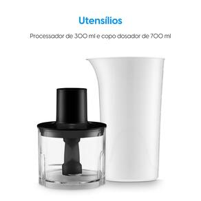 O aparelho é 3 em 1: mixer, triturador e batedor de ovos ou massas leves. Acompanha miniprocessador para triturar e picar alimentos com capacidade para 0,3 litros, copo para misturas com capacidade de 700 ml, lâminas em aço afiadas de alta performance, fouet flexível para bater ovos, claras ou massas leves.