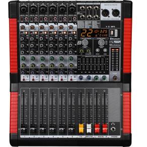 Mixer,Mesa De Som,6 Canais,Aux,Eq,Efeito,+48V,Usb,Bluetooth - Número de canais: 6 mono - Funções: - 1 Aux send, 1 Aux return - EQ principal de 3 bandas high/mid/low - EQ gráfico de 7 bandas na saída principal - PFL monitorado em cada canal mono - Processador de efeitos com 24 modos - Fader para controle geral de volume dos efeitos e potenciômetro para controle individual - Bluetooth - Leitor USB - Power +48 V em todos os canais - Filtro High Pass em todas as saídas de microfone - Função de gravação - Entrada para fone de ouvido,com controle de volume - Pan - Controle de ganho - Função mute - Fader logarítmico 60 mm. - Cor:lateral vermelha - Tensão: 110 220V fonte interna - Design moderno. - Ótimo custo/benefício. Homologação Anatel: 080281811799 Marca: Não Informado