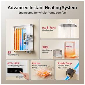 Este aquecedor destaca-se por sua alta eficiência energética de 98%, proporcionando economia de até 60% na conta de eletricidade. Ele aquece a água em apenas 3 segundos, fornecendo um fluxo de até 33 litros por minuto (8,7 galões por minuto), suficiente para atender simultaneamente até 56 pontos de uso, garantindo água quente sob demanda para toda a casa.