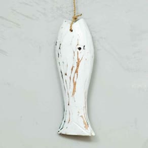 Material: madeira balsa Cores Predominates: Pátina Branca Peso: aproximadamente 200gr Altura: total 74cm / De Cada Peixe 15cm Largura: 6cm Origem: bali