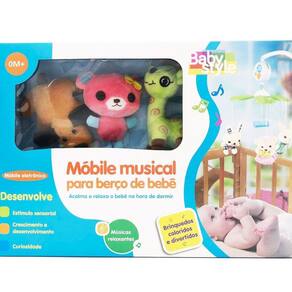 O móbile musical Baby Style possui 3 lindos brinquedos em tecido macio de plush. O móbile toca 30 minutos seguidos de música, sendo 25 melodias diferentes, possui controle de pausa, pular ou voltar música e volume . O móbile entretém bebês estimulando a visão e a audição e eventualmente nina os bebês para um sono tranqüilo e gostoso. Utiliza 2 pilhas AA (não inclusa). Adequado para berço, cama infantil, carrinhos, berços, bancos de carro, berços de transporte etc. Aprovado pelo Inmetro: