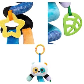 Com mordedor, barulhinhos, diferentes texturas e cores que auxiliam no desenvolvimento da criança.