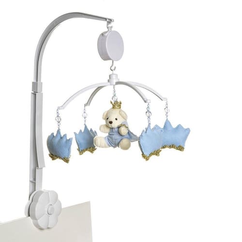 O momento do bebê em seu berço tem que ser relaxante e, ao mesmo tempo, deve ter elementos de entretenimento. O nosso móbile tem uma música agradável que vai embalar o sono dos pequenos e, ao acordar, terá lindos enfeites para entreter-se estimulando a coordenação motora e visual do nenê. Dados TécnicosMóbile musical com estrutura em plástico decorado com ursinho príncipe e corôas de feltro presos com cordão encerado altamente resistente.Algumas peças da decoração central pode ter variações de acordo com a disponibilidade no momento. FixaçãoA estrutura do móbile pode ser fixada no berço através de rosca ajustável. Informações adicionaisO móbile possui sistema giratório movido à corda portanto não utiliza pilhas.A música tocada pelo móbile é suave sendo agradável para o bebê e a duração do som ao rotacionar toda a corda pode variar de 2 a 3 minutos.Produto decorativo. MedidasAltura: 55 cmLargura da Haste Decorada: 29 cm x 29 cmHomologação Inmetro: CE-BRI/IQB 006455 55098/22-001
