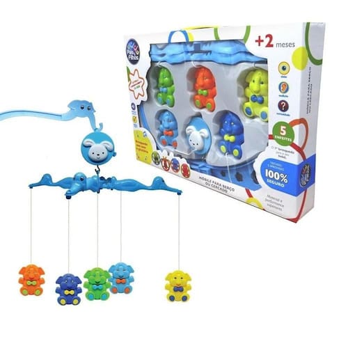 Móbile para berço com 5 enfeites elefantes - pais e filhosQuando a música toca, o móbile gira lentamente, reduzindo o estímulo visual antes da hora do bebê dormir.Os 5 enfeites pendurados no móbile viram brinquedos fáceis de pegar, para o seu bebê brincar este móbile vai fazer muito sucesso com os bebês Ce-br/cepex-i 01883-25Nbr nm 300/2004Segurança de brinquedos Medidas da embalagem (cxlxa): 42 x 28,5 x 6,0Ref: pf7800Fabricante: pais e filhosIdade recomendada: +2 mesesEan: 7896647078006