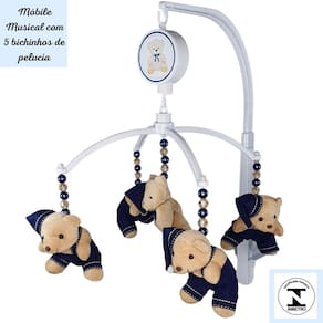 Mobile para berço bebê musical urso soneca Marca: erich baby Produto certificado pelo inmetro Ce-bri/iqb - 6437 nm 300/2002 Segurança do brinquedo O móbile é um item muito importante na decoração, bastante gracioso, meigo e lúdico Seu movimento vai entreter o bebê dentro do bercinho, ideal para embalar o sono do neném Os móbiles musicais são ótimos para estimular audição e visão do bebê. Não é a toa que eles são pendurados acima do seu amor. Especialistas dizem que os móbiles ainda estimulam o senso de direção e lateralidade, fazendo com que a criança acompanhe o objeto de um lado para o outro. Pensando em todos os benefícios para o bebê, a montagem do móbile é feita com os ursinhos olhando para baixo, para o bebê visualizar o ursinho por completo e estimula-lo ainda mais. Conteúdo: - mobile musical e giratório com 4 bichos de pelúcia - acompanha 1 suporte para fixar no berço e caixa de música à corda sem necessidade de uso de pilha. Contém a trava de interrupção, a canção dura em média de 2 a 3 minutos. Cores e estampas podem ser alteradas segundo nosso . Medidas: - bichinho de pelúcia 9 cm - suporte móbile: Altura: 55.00 cm Largura: 35.00 cm Comprimento: 45.00 cm Peso: 360 gramas Modo de montar: O suporte se encaixa em qualquer berço desmontável, chiqueirinho, carrinho e berço americano. Basta encaixar as peças e rosquear no berço que o móbile estará preso. Limpeza: Basta limpar com pano úmido. Embalagem: Largura 22,00 cm Altura 8,00cm Comprimento 31,00 cm Peso 500,00 g
