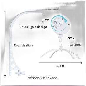 Mobile para Berço Bebê Musical Ursa Princesa Rosé MARCA: ERICH BABY Produto Certificado pelo Inmetro CE-BRI/IQB - 6437 NM 300/2002 Segurança do brinquedo O móbile é um item muito importante na decoração, bastante gracioso, meigo e lúdico Seu movimento vai entreter o bebê dentro do bercinho, ideal para embalar o sono do neném Os móbiles musicais são ótimos para estimular audição e visão do bebê. Não é a toa que eles são pendurados acima do seu amor. Especialistas dizem que os móbiles ainda estimulam o senso de direção e lateralidade, fazendo com que a criança acompanhe o objeto de um lado para o outro. Pensando em todos os benefícios para o bebê, a montagem do móbile é feita com os ursinhos olhando para baixo, para o bebê visualizar o ursinho por completo e estimula-lo ainda mais. Conteúdo: - Mobile musical e giratório com 4 bichos de pelúcia - Acompanha 1 suporte para fixar no berço e caixa de música à corda sem necessidade de uso de pilha. Contém a trava de interrupção, a canção dura em média de 2 a 3 minutos. Cores e estampas podem ser alteradas segundo nosso . Medidas: - Bichinho de pelúcia 9 cm - Suporte móbile: Altura: 55.00 cm Largura: 35.00 cm Comprimento: 45.00 cm Peso: 360 gramas Modo de montar: O suporte se encaixa em qualquer Berço desmontável, Chiqueirinho, Carrinho e Berço Americano. Basta encaixar as peças e rosquear no berço que o móbile estará preso. Limpeza: Basta limpar com pano úmido. Embalagem: Largura 22,00 cm Altura 8,00cm Comprimento 31,00 cm Peso 500,00 g Marca: Não Informado