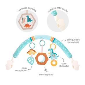 O móbile conta com dinos de pelúcia macios com chocalho interno, um mordedor de silicone texturizado, espelhinhos divertidos e peças removíveis, ideais para o pequeno explorar, segurar e brincar. Cada detalhe foi feito para entreter com segurança, além de incentivar a curiosidade e o desenvolvimento sensorial do bebê.