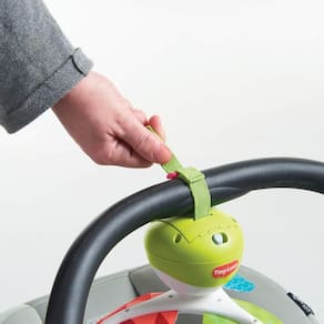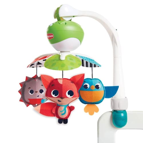 Móbile que pode ser encaixado em diferentes acessórios, como berços, cercados, bouncers, carrinhos e moisés. Oferece 30 minutos de música contínua. Um mobile colorido e cativante que vai a toda parte com o bebê!