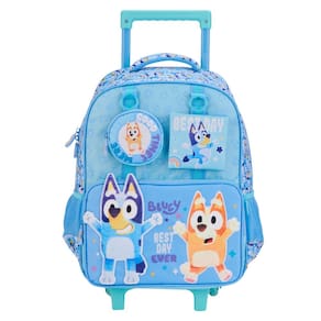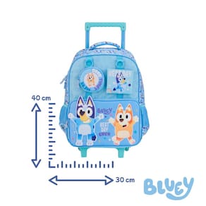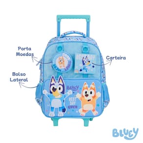 A diversão vai junto com a criançada! A mochila de rodinhas Bluey é perfeita para o dia a dia escolar. Com estampa vibrante do personagem, estrutura resistente, puxador em alumínio e rodinhas para facilitar o transporte. Possui compartimento espaçoso, bolsos laterais e alças acolchoadas. Ideal para meninos cheios de energia e alegria!