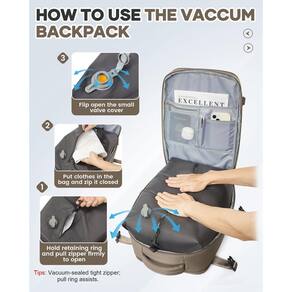 - ?Sistema de vácuo fácil de usar?O sistema de vácuo é simples de operar. Basta abrir a válvula, pressionar manualmente para liberar o ar e fechá-la firmemente; a mochila a vácuo comprime efetivamente seus pertences, economizando até mais espaço; você pode facilmente embalar mais roupas ou outros itens essenciais para suas viagens ou uso diário. (Você também pode usar uma bomba de vácuo para compressão rápida, esta mochila não vem com uma bomba de vácuo).