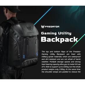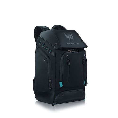 Acer PBG591 Mochila utilitária para jogos Predator, resistente à água e à prova de rasgos, serve e protege o laptop para jogos Predator de até 43,9 cm, preta com detalhes azul-petróleo - Painel traseiro de malha acolchoada para fluxo de ar ventilado - Alça interna para fone de ouvido - Proteção de revestimento repelente de água e zíperes - Bolso inferior para adaptador de energia Tijolo e pertences pessoais - Design de passagem de alça de bagagem