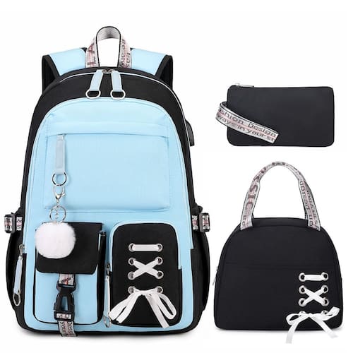 ACESAK Mochilas para meninas, adolescentes, crianças, escola primária, ensino médio, universitária, mochila escolar para livros, Azul, Moderno - ?Kit de combinação perfeito?Encontre todas as suas necessidades de volta às aulas neste conjunto de mochila para meninas, lancheira e bolsa pencial. Volte para a escola com este conjunto! A elegante mochila para meninas acomoda seus itens essenciais de estudo, a lancheira traz refeições deliciosas e o estojo guarda suas canetas. Sinta-se bem ao viajar para a escola com esta mochila infantil requintada e de alta qualidade. - ?Leve e resistente à água?Feita com o melhor tecido Oxford 900D leve e durável e adornada com forro de poliéster acolchoado, esta mochila feminina combina perfeitamente durabilidade com elegância. Diga adeus ao desbotamento da cor, odores e preocupações ambientais. Fique tranquilo, seus livros e laptops permanecerão secos, mesmo na chuva, tornando sua viagem para casa sem preocupações graças a esta mochila feminina resistente à água. - ?Porta de carregamento USB?Esta mochila para meninas não é apenas uma mochila escolar – é o seu centro de carregamento em movimento! Com uma porta USB integrada e cabo de carregamento, você pode renovar seu telefone enquanto caminha, anda de bicicleta ou viaja. E adivinha? Há também um conector de fone de ouvido para você tocar suas músicas favoritas sem complicações. Caminhe, carregue e aproveite sua música – Absolutamente! É uma experiência tão legal, certo? - ?Grande capacidade?Medindo 31 x 18 x 45 cm, esta mochila para meninas oferece uma organização conveniente para todos os seus pertences. O compartimento principal espaçoso desta bolsa para escola pode armazenar laptops de 15,6 polegadas, livros didáticos, revistas, arquivos A4, o compartimento do meio com compartimentos para itens essenciais da escola, caderno e estojo, 3 bolsos externos frontais permitem acesso rápido a itens essenciais em movimento, 2 bolsos laterais para garrafa de água e guarda-chuva, bolso traseiro oculto com zíper mantém seu telefone seguro. - ?Perfeito para qualquer ocasião?Este conjunto de mochila para meninas adolescentes é feito sob medida para atender às necessidades das meninas que frequentam o ensino fundamental, médio ou médio. Além disso, complementa requintadamente várias atividades ao ar livre, como viagens, acampamento e caminhadas. O que está incluído? Uma mochila de qualidade para meninas, uma linda bola peluda, uma lancheira, uma bolsa lápis, juntamente com nossa garantia de 12 meses sem preocupações e atendimento ao cliente super amigável. Idade recomendada: acima de 3 anos.