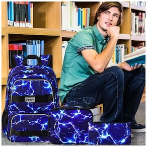 Conjunto 3 em 1 composto por mochila para notebook, lancheira e estojo, com estampa de raios em azul, indicado para adolescentes, jovens e adultos em rotinas de escola, faculdade, trabalho e uso diário. A mochila principal comporta notebook de até 17", livros, cadernos, pasta A4, estojo, carregadores e outros acessórios, enquanto a lancheira e o estojo complementam o conjunto para transporte de refeições e materiais de escrita.