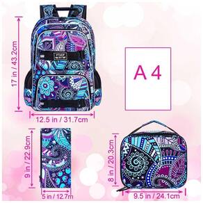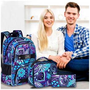 Conjunto 3 em 1 composto por mochila para notebook, lancheira e estojo, com estampa floral em roxo escuro, indicado para adolescentes, jovens e adultos em rotinas de escola, faculdade, trabalho e uso diário. A mochila principal comporta notebook de até 17", livros, cadernos, pasta A4, estojo, carregadores e acessórios, enquanto a lancheira e o estojo complementam o conjunto para transporte de refeições e materiais de escrita.