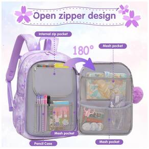 O tecido é resistente a rasgos e respingos, com alças de ombro largas e acolchoadas e painel traseiro respirável para maior conforto em uso prolongado. Os múltiplos bolsos e compartimentos facilitam a organização de materiais, enquanto o visual em tons de roxo e detalhes decorativos tornam a mochila adequada tanto para uso escolar quanto para viagens curtas e atividades diárias.