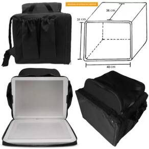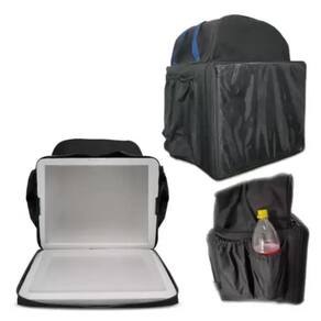 Mochila Bag Motoboy Pizza Delivery Com Caixa IsoporObs: anúncio referente a mochila bag completo: isopor + capa mochila Atenção: isopor não laminado Especificação técnica: Plástico frontal transparente para endereços, panfletos e logo marca; Alças ajustáveis com fecho em abs; Fechamento através de zíper de qualidade; Possui partes refletivas frontais; Suporta 4 garrafas de refrigerante nas laterais; Mochilão superior térmico para pizzas e refrigerantes, etc; Caixa de isopor com capacidade para 45 litros; Fabricada em tecido nylon 600, de alta resistência. Medidas do Produto: 20x20x20 cm