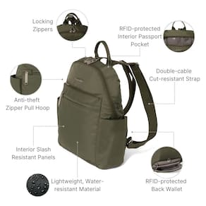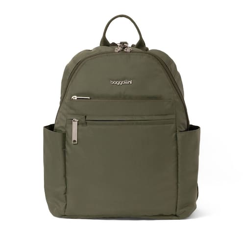 Baggallini Mochila feminina Securtex antifurto para viagem de férias, 25 x 33 cm, nylon resistente a cortes, com zíperes de bloqueio e proteção RFID, Tomilho - Leve e resistente à água: Feita com material resistente à água, esta mochila antirroubo é fácil de limpar o local; e com pouco mais de 500 g e medindo 25 cm de largura x 33 cm de altura x 8 cm de profundidade, é a escolha leve perfeita. - Proteja sua paz de espírito: com uma carteira traseira com RFID integrada, esta mochila de viagem garante que suas informações pessoais estejam seguras tanto em viagens diárias quanto em aventuras épicas, tornando-a uma opção confortável e segura. - MATERIAL RESISTENTE A SLASH: Projetada com tecido resistente a cortes e antirroubo, esta pequena mochila protege seus pertences e resiste ao clima, garantindo que sua mochila de viagem permaneça em perfeitas condições - Zíperes antifurto: Desfrute de uma camada extra de segurança com zíperes de bloqueio antifurto modernos e funcionais, adicionando tranquilidade e conforto às suas viagens em movimento. - Essenciais de viagem: esta mochila de viagem versátil pode ser usada como bagagem de mão ou uma mochila de dia conveniente, tornando-a uma parte indispensável do seu equipamento de viagem. É o tamanho perfeito para todos os seus itens essenciais de viagem.