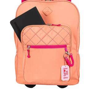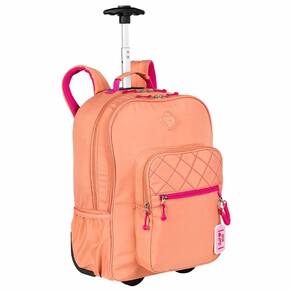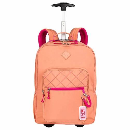 Coberta por um tom de pêssego, detalhes em cor-de-rosa e um pingente que dá um toque de charme, a mochila carrinho da coleção Sestini Lover apresenta um visual delicado e jovial para se encaixar na rotina de estudos. Para guardar seus cadernos, livros, estojos e outros materiais, conta com 2 compartimentos amplos que permitem uma melhor organização, enquanto os 2 bolsos frontais são espaçosos e permitem o armazenamento de objetos menores, e o bolso lateral é perfeito para levar a garrafinha. Equipada com um carrinho reforçado em alumínio, rodinhas e alças de costas como um segundo plano, proporciona um transporte leve e confortável, Características