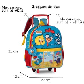 Encantadora e cheia de detalhes lúdicos, a Mochila de Carrinho Galinha Pintadinha GP25055 é perfeita para acompanhar as crianças nas aventuras da rotina escolar Confeccionada em poliéster de alta qualidade, possui frente em PVC com alto relevo e personagem bordado, o que garante um visual vibrante e divertido. O compartimento principal é espaçoso, ideal para cadernos, estojos e demais materiais escolares, além de contar com bolso frontal transparente, que vem com cards de diferentes cenários para a criança brincar e personalizar a mochila, estimulando a criatividade e a imaginação. Nas laterais, possui bolsos em tela para garrafinhas e objetos de fácil acesso. Acompanha um chaveiro exclusivo com som, trazendo ainda mais diversão ao dia a dia. O carrinho tem puxador em alumínio, rodinhas resistentes e base de apoio, garantindo praticidade e segurança. As alças de costas ajustáveis e acolchoadas permitem também o uso como mochila tradicional. Dimensões aproximadas: 33x27x12cm. Marca: Não Informado Ean: 7899753559100