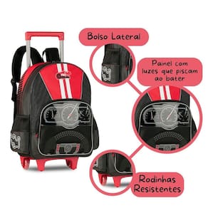 O destaque fica por conta do painel frontal com luzes que piscam ao bater, tornando a mochila divertida e interativa Conta ainda com rodinhas resistentes, puxador em alumínio com duas alturas, base de apoio e alças de costas acolchoadas, permitindo o uso como mochila ou no modo carrinho. Possui também alça de mão superior.