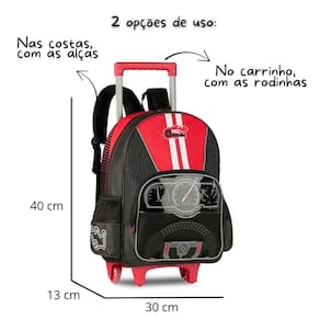 A Mochila de Carrinho Fast Machine FM25030 é uma explosão de estilo e praticidade para os pequenos que amam velocidade Confeccionada em poliéster resistente, possui puxadores de metal personalizados e etiquetas emborrachadas que deixam o visual ainda mais moderno. Seu compartimento principal é amplo e ideal para guardar todo o material escolar, com fechamento por zíper e bolso frontal que ajuda a manter tudo bem organizado. Nas laterais, os bolsos telados permitem carregar garrafinhas com facilidade. O destaque fica por conta do painel frontal com luzes que piscam ao bater, tornando a mochila divertida e interativa Conta ainda com rodinhas resistentes, puxador em alumínio com duas alturas, base de apoio e alças de costas acolchoadas, permitindo o uso como mochila ou no modo carrinho. Possui também alça de mão superior. Dimensões aproximadas: 40x30x13cm. Marca: Não Informado