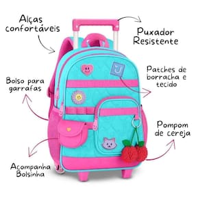 A mochila de carrinho da coleção Juju Teófilo é puro encanto e foi pensada para acompanhar as pequenas com muito estilo, conforto e praticidade na rotina escolar. Confeccionada em poliéster soft com acabamento em matelassê, ela traz patches emborrachados e de tecido que deixam o visual ainda mais delicado e divertido, além de acompanhar um charmoso chaveiro de cerejinhas e uma bolsinha exclusiva que completa o look de forma única.