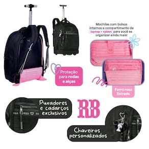 A Mochila de Carrinho Rebecca Bonbon RB27000 é o modelo perfeito para quem ama estilo e praticidade no mesmo produto. Feita em nylon resistente com matelassê de estrelinhas e corações, ela tem aquele visual moderno e super fashion. O compartimento principal é bem espaçoso e ainda vem com divisórias acolchoadas para notebook e tablet. Na frente, são quatro bolsos com zíper, sendo um deles organizador interno, além de bolsos laterais em tela para garrafinha ou acessórios. E não para por aí: a mochila vem com chaveiro pompom em formato de coração, mascote 3D, cadarço decorativo, medalhinha de metal e até uma cartela exclusiva de adesivos Rebecca Bonbon para deixar tudo ainda mais estiloso. O melhor é que você pode escolher como usar: no carrinho, com rodinhas super resistentes e puxador de metal com duas alturas, ou nas costas, com alças acolchoadas bem confortáveis e com proteção para as rodinhas não sujarem a roupa . Também tem alça de mão superior e zíperes personalizados, que são um charme à parte. Disponível em quatro cores lindas - Preto, Rosa, Lilás e Verde. Dimensões aproximadas: 48x35x19cm Marca: Não Informado
